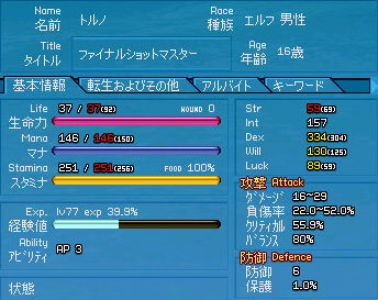 転生前ステータス。 転生前の転生が14回だから…15回目の転生でいいんですよね?間違ってないよね? バカじゃないよね? (生活スキル、錬金術スキル変更なし。 変身、半神化は省略) 前回の転生。 ファイナルショット 5 → 1 (Dex+14、スタミナ+11) マナシールド 練習 → D (マナ+6) ファイナルショットマスター!!ヽ(゚∀゚)ノ Dexだけスクスク育つ弓エルフ。 さてさて、ファイナルショットをマスターしたことですし今後の育成方針でも。 まずはマナシールドをランクAにします! じゃないとせっかく作ったグロリアスロングボウを作った意味が… (マナシールドA異常で最大ダメージ+5) あ、いや、条件満たしても使いませんけどね。 そして今後上げる予定のもの。 マジックマスタリ F → 6 (マナ確保、ハードペッカES発動ランク) フレイマー 練習 → 7 (燃えるES発動ランク) アタック F → 5 (木の針ES発動ランク) ・・・アタック? *** ↑よろしければクリックお願いします。 PR TrackbacksTRACKBACK URL : CommentsComment Form |