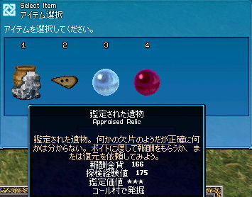 毎度お世話になってるボイトに鑑定をお願いします。 その際のちょっとしたコツとか。 「欠片」と明記されているものは復元すると完成させないと、 探索経験値が0になるのでこのまま報酬を貰ったほうが楽。 あと鑑定価値が☆2つのものは極端に復元成功率が低いので、復元させずに報酬を貰うのが(・∀・)イイ!! とはいえ、やり方はそれぞれなので一番効率がいいと思ったやり方でやるのがいいと思いますよ。 …と、コール村周辺で遺物を探していると。 あちこちにアクセサリが。 何だコレ?と初めは良く分かりませんでしたが。 宝箱の位置をマーキングしていたんですね。 宝箱の位置は固定なので、ドロップしてなかなか消えないアクセサリでマーキングするのは有効かもしれないですな。 まぁアクセサリを落とすことによってサーバーに負荷がかかることもあるでしょうし、推奨は致しかねますケド(´Д`;) PR TrackbacksTRACKBACK URL : CommentsひゃっほーいPosted by 櫻咲 2009/01/24(Sat) 00:43:15 EDIT 鑑定価値=成功率ってのは知らなかったー(´・ω・)