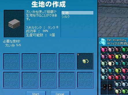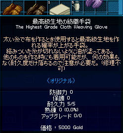 接頭 : エイシェント/古代の 休憩8以上の場合、Luck 20増加 休憩7以上の場合、最大ダメージ6~12増加 ランクに関係なくエンチャント可能 接尾 : ダークネス/暗黒 防御3減少 Will 5減少 レベルが30以上の場合、最大ダメージ5~15増加 が完璧な理想なんですが…(ヾノ・∀・`)ムリムリ 休憩スキルを上げるほど余裕がありませんし、買うとなると金銭面ですら厳しい。 ということで、どちらか片方だけなら何とか手が出せる範囲なのでココは暗黒鎧を作ろうと思います(ノシ゚Д゚)ノシ まずは軽鎧作りから! 作成するのは単価の安さと耐久の高さでクロスメイルを選択。 作成不可の軽鎧を選べば耐久はもっと高く出来ますが…高いのよね(;´Д`) 材料はなるべく自分で採取します。 (金銭的な関係で) クロスメイルに必要な材料は 「最高級生地×2、細い糸×1、組紐×1」 なので最高級生地を。 (ノシ゚∀゚)ノシ その後雷雨が来るというのでティルコに移動! 無事3着完成(*゚∀゚)b (写ってるのは2着ですが…) 2009.01.04 Sun 01:06:52 鉱物採取を考えるあけましておめでとうございます。