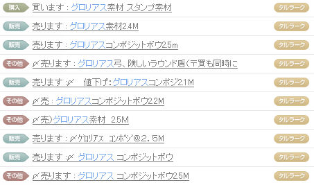 公式の取引掲示板を覗いてみようか。(カチカチ ・・・ 素材で2.5M…だと… 実装された頃は700kとか、900kだったのに。だったのに。 どうしてこうなった… 2009.11.25 Wed 00:06:08 復帰!!2009.10.07 Wed 00:24:52 マビノギ&ブログの休止報告突然ではありますが、11月中旬~下旬までマビノギとブログを休止いたします。