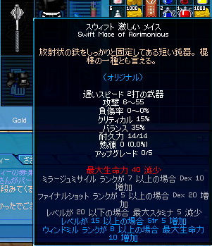 タルティーン影ミッション「グラックカウを退治」をぐーるぐる。 スイッチを見つけるためにはピンク以外のアラトの実(赤、黄、紫)が必要です。 全部ピンクだったときは流石に深い悲しみに包まれました。 そしたらこんなものがポロっと。 こんな微妙性能(エルフ視点)の癖にかなり高価で取引されているようです。 ランク9ESということで色々下地に使えるみたいですね。 (主に木の針とか) |
