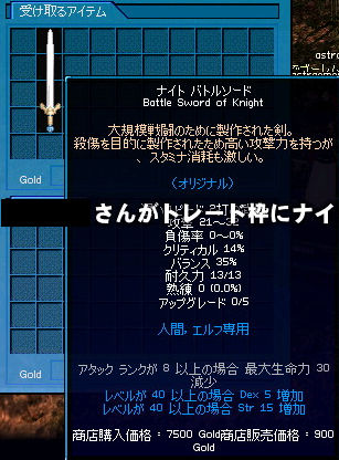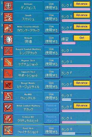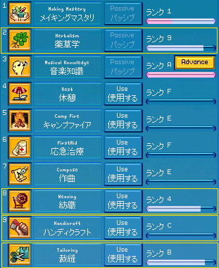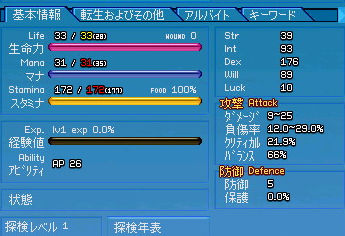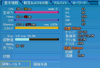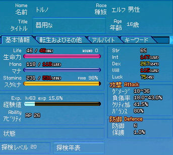 半神化でコール村周辺を遺物探し。 ひたすら半神化で(略 転生前ステータス。 半神化を駆使しても探索レベル20という完全に切羽詰った状況…!! 前回の転生。 薬草学 A → 9 (Int+1、Dex+1) 紡織 6 → 4 (Dex+7) ハンディクラフト D → C (Dex+1) 裁縫 C → B (Dex+1) 野生動物調教 C → 9 (意味なし) ファイナルショット C → 8 (Dex+10) 合計Dex+20。 だんだん素Dexが200に近づいていく…ッ! なんだか興奮しますね(*゚∀゚)=3ハァハァ ついでに探索レベルの昇級クエが免除になったとのことで一応検証。 5のキャップをすっ飛ばして8まで! それにしてもこれは楽チンですなー。 まぁ今までが面倒くさすぎただけですが。 2009.09.10 Thu 01:27:11 コリブなんちゃらの守護ワイン醸造から得たクエストスクロールから「コリブ渓谷の守護」です。