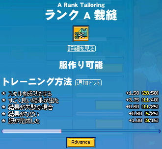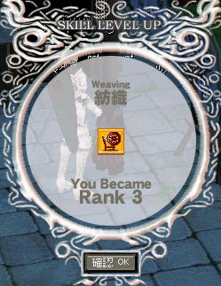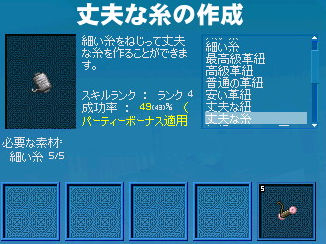 紡織最後の壁、ランク4のトレーニング。 なにが壁かというと、その成功率。 丈夫な紐。 月曜日の生産成功率上昇効果とパーティボーナスで90%まで上げることができますが、毛集めるのが面倒。 問題の丈夫な糸。 上の画像は月曜日以外のパーティボーナス適用だっけかな…? この成功率で作成するのはなかなか大変ですが、 ランク8のランダム成功(しかも10%前後)に比べればチャンチャラおかしいです(*´3`)プフー どちらかといえば成功率の高い「丈夫な紐」を埋めたほうが楽…な気がする。 丈夫な紐 : 成功率が高い / 材料集めが面倒 丈夫な糸 : 成功率が低い / 材料集めが(ある程度は)楽 そこは人それぞれですかね。 ランク8突破してもう訪れないであろうと白クモ道場。 通りすがりのギルドメンバーにムカデきもっ!!と言われました。 ムカデちゃうねんで。 そんなこんなでー! ランク4突破ー!! テンション上がってきた(ノシ゚∀゚)ノシ 2009.09.11 Fri 01:52:58 12回目転生今回少々プレイ時間が少なかったので探索レベルが異常に低く…