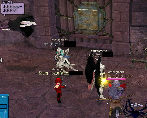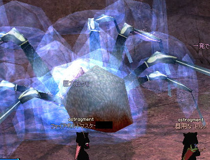 敵が硬い。 硬すぎる。 通常アルビ上級1人用でも硬い敵がハードモードになってさらに硬く。 残り1匹になると皆でミル祭り!(ノ゚∀゚)ノ ↓ アイススピアの合間合間にマグナムショットを打ち込むと殲滅速度がちょっと上がったり。 ちなみにミラージュミサイルを撃ち込むと凍ってる間にショックダメージが入るので、ISと相性がいいと思います。 私はランクがFなので使いませんが… そんなこんなでボス部屋に。 青黒クモ蹴散らせば後はアラクネだけです。 さぁ張り切って行ってみましょう! 何もできないアラクネ(´・ω・)カワイソス 見てごらん…アラクネおばあちゃん凄い楽しそうに飛んでるね… お疲れ様でした!! 2009.09.04 Fri 01:46:27 ギルドで夏祭り風 |