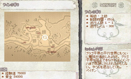 ちなみにワインの種類によって得られるスクロールが異なります。 ・ブラゴノワール : ワインの香り ・エランスソーヴィニヨン : コリブ渓谷の守護 クエスト内容。 「ワインの香り」は1人用クエスト。 クエストを開始すると、この印のところから開始します。 クリア条件。 マップにスタート地点が表示されているそうですが… 何処ここ。 現在マップバグのせいで自分が何処にいるかさえ分からない状況。 上の画像はアラトの実を使っている状態です。 (赤:スイッチ、黄色:開始地点) おそらくはこんな感じかと。 スイッチは7つ。 固定なので場所を覚えればアラトの実がなくても何とかなりますが、初回は必需。 スイッチ1箇所につき敵1~3匹。 強いクラッグカウとかシャドウウィザード(女)の多タゲとかに気をつければ余裕です。 7箇所スイッチの敵を全部倒せばクリア。ボスなし。 5分~10分ほどでクリアできる(まぁ上級だからかもですけど…)ので、 ワイン報酬 : 約6万 ワインクエスト×2(スクロール2枚もらえます) : 75,000×2 = 15万 . , -‐:::: ̄:::: ̄::::::::::::`:::::ヽ /