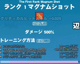 いつの間にかランク1のトレーニングがココまで埋まってました。 スキルを成功させる : 3,000回 クリティカルヒット成功 : 3,000回 最後の一撃を加える : 1,500回 クリティカルで最後の一撃 : 300回 これはエルフの数字で、人間はこれより100~1,000回多いです。 最後はキア上級で追い込み!(ノ゚∀゚)ノ ちなみにマグナムショットのクリティカルヒット成功ですが、クリティカルの上限が30%なので、 単純計算で10000回マグナムショットを撃つ必要があります。 人間の場合は4000回なので13333回です…(ノ∀`)タハー *・゜゚・*:.。..。.:*・゜祝10,000回゚・*:.。. .。.:*・゜゚・* 「サキュバスを誘惑した」タイトルと比べがちですが、こっちのがなんか…頑張ったって感じが!! 2009.07.30 Thu 00:28:41 ブラックサバト風結婚式 |