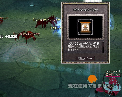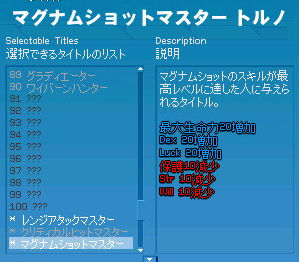 弓スキルのマスタータイトルはどんなのがあるのかな?というわけで使い勝手とか考えながら比較してみます。 ■ レンジアタックマスター 最大生命力 20増加 最大スタミナ 30増加 Dex 20増加 Str 20減少 Will 20減少 ※ スタミナ30増加がマグナムショット多様の弓師にはありがたいタイトル。 その代わり最大生命力20増加が低ライフ型にはやや使いにくく(盗賊ESとかで押さえ込めるけど) Will減少によりクリティカルが2%下がる(2%くらいなんともないかも知れないけど) ■ マグナムショットマスター 最大生命力 20増加 Dex 20増加 Luck 20増加 保護 10減少 Str 10減少 Will 10減少 ※ Luck20増加(クリティカル4増加) - will10減少(クリティカル1減少) = クリ3%増加 レンジアタックマスターはスタミナ増加、マグナムショットマスターはクリティカル増加。 どちらが欲しいかによって付け替えるのがいいかも。 ■ ファイナルショットマスター(エルフ限定) Dex 30増加 Will 15増加 最大生命力 15減少 Str 10減少 ※ Dex30増加、Dex30増加!、Dex30増加!!! Dexが30増加するタイトルはファイナルショットマスター以外では「裁縫マスター」と「鍛冶マスター」。 どちらも取るには途方もない時間とお金がかかる。 最大生命力減少も低ライフ型にとっては使いやすく、APさえ何とかなればとっとと取りたいタイトル。 (とはいえレンジorマグマスをつけていた場合、Dex上昇値が20→30で10上昇(最大ダメージ4上昇)で、大した効果は体感としては得辛いかもしれない) ■ ミラージュミサイルマスター(エルフ限定) 最大マナ 20増加 Dex 15増加 Int 15増加 Str 10減少 Will 10減少 ※ ミラージュミサイルを主体とした戦い方なら使いやすいタイトルかも。 ■ アローリボルバーマスター(人間限定) 最大生命力 20増加 Dex 20増加 Will 20増加 防御 5減少 Str 10減少 Luck 10減少 ※ Will20増加(クリティカル2%増加) - Luck10減少(クリティカル2%減少) = クリティカル±0 これつけるならマグナムショットマスターつけた方がいい気がする。 投擲?サポートショット? なにそれ。 2009.07.31 Fri 00:52:03 マグナムショットマスター取得8回目(9かな?)の転生時にマグナムショットランク1にしましたが。