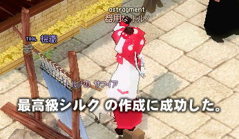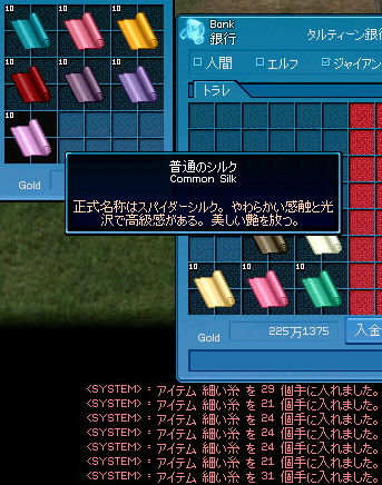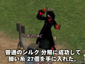 ただ一言、マゾい。 クモの糸を集めるときは柵に引っ掛けて… エルフのハイドを使えばこんなことできます。(人間もch移動を使えばできます) ただ集めた白クモを他人にウィンドミルで全部潰されても、文句は言わないようにしましょう…(゚ω゚) 後はただひたすらにシルクを作る。 好きとか嫌いとかはいい、シルクを作るんだ。 安いシルク、普通のシルクは分解。 (最高級、高級シルクは相方へ全て献上) 前に分解微妙とかいってたけど、スイマセン分解最高でしたー!! そして! ぱっ! ぱぱーん! ※ 試行回数 : 851シルク 最高級シルク : 100 高級シルク : 80 普通シルク : 188 安いシルク : 483 使用最高級シルク手袋 : 86個 トレーニング日数 : 16日 一日平均シルク製作数 : 53個 一日平均クモの糸拾い数 : 53個×5 = 265個 使用金額(水曜日の値引き効果とかはメンドイので考えずに) ・クモの糸 : 全て拾ったため0G ・最高級シルク手袋 : 4000G×86 = ▲34万4000G ・使用後最高級シルク手袋売却額 : 333G×86 = 2万8638G ご参考までに…(´Д`;) 2009.08.01 Sat 00:58:44 弓スキルマスタータイトル比較昨日マグナムショットマスター取得の記事を書いたわけですが、