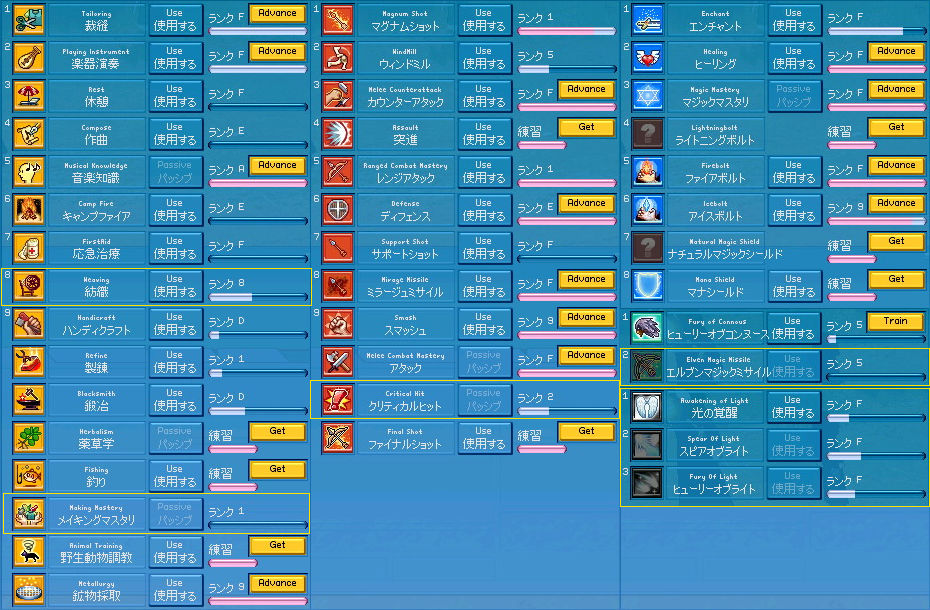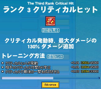 メイキングマスタリーをランク1に(ノシ゚∀゚)ノシ ・・・あれ? 転生前のステータス。 レベル上げ結構頑張ったほうですが・・・ ・・・ 前回の転生時。 上げたスキルは、 メイキングマスタリー 8 → 1 (Dex+14、スタミナ+70) クリティカルヒット 5 → 2 (Will+9) 紡織 9 → 8 (Dex+3) ・・・ハイ、クリティカルランク1に出来ませんでした(ノω`) ちゃうねん、トレーニングが大変なのが悪いねん。 で、転生後のステータス。 実にションボリ。 APは一応クリティカルヒット2→1に必要な20は確保(´∀`) 今回上げるスキルは…引き続きクリティカルヒットをランク1に。そして、 G78に必要な野生動物調教ランク9。 トゲESのDex+10が発動する薬草学ランク9。 あといよいよファイナルショットランク1を目指します。 エルフの特権なので(`・ω・´) 9回目の転生…かと思ったら10回目だったでゴザル。 PR 2009.06.22 Mon 00:46:41 ほのぼのHATAKEライフタルティーンの実装で畑が出来てしばらく経ち…混み混みでなかなか借りられなかったのですが。