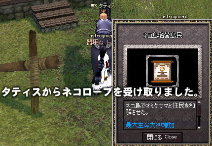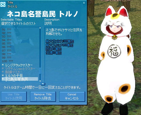 釣りはもう勘弁してください。ネコ島ダンジョンのネコアーチャー(´∀`)ニャー すかさず相方が… ヒューン… 画面外に2匹…全部巻き込んでます。 中級魔法は恐ろしいですのう… ファイヤボールは5チャージしないといけないのがちょっと使い辛いのがネックですねー。 ダンジョンをサクッとクリアしてオミケサマと村長の間を行ったりきたり。 ダンジョンについてはコチラとwiki参照。 クエストを終わらせると「ネコ島名誉島民」タイトルとネコローブが手に入ります!(ノシ゚∀゚)ノシ タイトルは生命力、防御、保護が上がったりでいたせりつくせりな感じ。 ネコローブは…