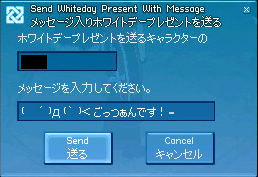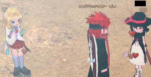 まぁリアルは1個も貰っていないので返す必要がなくて楽でしたけどね! …ヽ(`Д´)ノ バレンタインイベントのときはケーキひとつ1,500Gという見事なぼったくり具合でしたが、 今回はダンジョンへいってこいというお達し。 随分経済的なんですね! 男女差別じゃないの? …というのも前回のバレンタインは女性から貰ったわけではなく、 自分でお金を出してチョコケーキを買ってもらっていたわけで。 …泣いてませんよ?(´;ω;`) さて、ダンジョンのボスはこの魔女さん。 なんかサンダーとか撃ってきます。 (もちろんシニマシタ) おつかれさまでした。 報酬としてクッキー×5、通行証×2を入手できます。 クッキーは2×2インベントリで、物凄い邪魔なので… バレンタインの時に手伝ってもらったメンバーに(ノ゚Д゚)ノ ポーイ。 そのあと皆で100個やってやんぜー!というノリになり… 見事にリベンジ完了です。 バジルトマトサラダでムキムキになるがいいわフハハハハー!!! と思ったら転生してるー!!(ガビーン) 劇的ビフォーアフターは置いておいて、これでチョコレートソード、キャンディソードが揃いました。 さぁ特別なこととは!どんな凄いことがー!!! ( ゚д゚) (つд⊂)ゴシゴシ (;゚д゚) (つд⊂)ゴシゴシ . _, ._ (;゚ Д゚)コレだけ!? つまり… ちなみに2刀にすると、です。 !!! そ、そんなバカな!!! 何事もやる前から諦めていたらダメだと思うんだよね。 きっと開発元も特別にエルフでも2刀できるようにしてくれてると思うんだ!そう思いたい!! ※必死に装備しようとしています。 ネクソォォォォォォォォォン!!! おまけ なんか皆で取り囲んで「コレでエルフもハート出してるようにみえる!」と。 う、嬉しくなんかないんだからねー!!? 2009.03.18 Wed 01:28:22 新しい道2009.03.17 Tue 01:35:54 ロンガ守護者の遺跡ダンジョン人数がいたので気軽に行ける上級ダンジョンってないかな?という話になり…