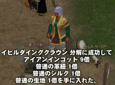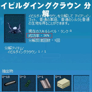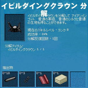 なんとギルドメンバーが、「使わないから」という理由でユリES付のアクセサリーを!!! 売れば30万はくだらないって言うのに、この余裕…! もう感極まってしまって、 告白してしまいました。 もちろん返事は「お断りします!」 そんでもってサクッと鋼玉を貼り付け。 殆どペナルティらしいペナルティなしで最大ダメージ+12です!*・゜+ (゚∀゚) +.:*・ しかし…ちょっと待ってください。 のみの心臓の俺にはこんな高価なものは常用できません。 (ユリ30万+鋼玉10万=約40万) 20歳アクセサリで貰っていたふたご座ES付のアクセサリに石英ESをつけます! ■石英ES 探索レベルが8以上の場合最大ダメージ+5 探索レベルが15以下の場合最小ダメージ-4 Luck5減少 鋼玉の劣化バージョンですが、露天で探せば1,000~5,000G程で買えるので手軽に運用できます(゚∀゚)b サクッと貼り付けして! 最大ダメージ+9ですが、安値なのでガシガシ使えます!ヽ(゚∀゚)ノ 2009.03.10 Tue 00:47:03 分解ジャイアントのランクE→A 生産品を分解する昨日作ったイビルダイングクラウンを分解して素材に戻します!