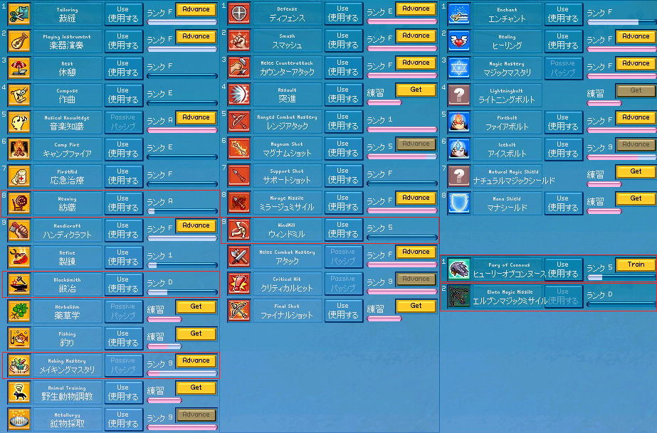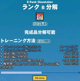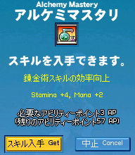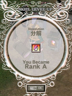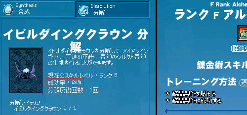 成功率24%ー!!(;´∀`)…うわぁ… いくらなんでも低すぎるので、ちょっと成功率を上げる努力をします! まずはあらゆる錬金術成功率が上がるアルケミマスタリを。 「錬金術で敵を攻撃する」トレーニングを埋めて。 練習→ランクFに(ノシ゚∀゚)ノシ さぁコレで成功率が1%くらいは上昇… しませんでした。 (´Д`)なんで?? しょうがないので、スキルランクそのものを上げるしかありません。 前回ではEだったランクもいつの間にやらBに。 そんでもってコツコツとトレーニングを埋めて… ランクAに! +曜日効果+雨で、36%まで上昇! …ちょっと邪な考えが浮かびましたけど、気にしないで分解開始です! ちょおりゃぁぁぁー!! 無事成功! …したのは4つのうち1つでした。 もう認めざるを得ない。 分解微妙。 特に完成品を分解する際には、ですが。成功率が低すぎる。 もっとランク上げれば成功率上がるんですかね…無理ッポ(;´∀`) ちなみに未完成だと分解できません。 |