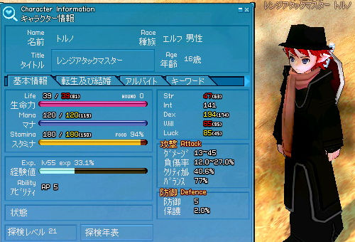 相変わらず遺物で探索LVを上げて、キリのいいところで次に向けて溜め込み。 最後にキアハードダンジョンでLV上げ! スイッチ部屋で敵フィーバーするとミラージュミサイルの血柱がとても…気持ちいいです… (*゚∀゚)=3ハァハァ レベル55+器用なタイトル(σ・∀・)σゲット! 装備でブーストしてるので素Dexは200もいってませんけどね… 転生前のステータス。 以前のスキルはコチラ。 主に上げたスキルは、 ウィンドミル F → 5 (Str+17、Will+31) 紡織 E → A (Dex+8) 鍛冶 E → D (Dex+1、Int+1) 前回精錬を頑張ったせいか、今回はあんまり頑張ってないように見えますね…(ノ∀`) まぁ目標は達成したしいいか! あと紡織ランク上がってますが、基本シルクを作ってるだけなので記事にし辛いです。 …生地を作らないだけに…フフフ… 2009.03.11 Wed 00:35:53 最大特化アクセサリー最大特化装備シリーズ!