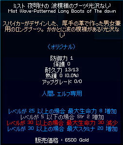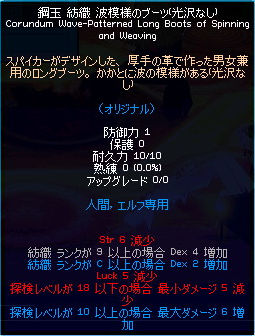 キア通常ハードにきてみました(ノ゚Д゚)ノ 「ボス級トレならあの世のゾンビでいいじゃない。」 と聞こえてきそうですが、下記の理由のためゾンビは微妙です。 ・エルフでは移動手段がない ・連れて行ってもらったとしても、自分のSTRではゾンビを倒すのに時間がかかる 残念ながらココの主体MOBであるゴブリンは「とても強い敵」で、ボス級ではなかったわけですが(ノ∀`) くるくるレベルアップ! そんなわけで。 ボス級が殆ど埋まらないまま、「強い敵」「とても強い敵」勝利トレを埋めて… ランク7に!(ノ゚∀゚)ノ ドンドン「ボス級の敵に勝利する」トレのウェイトが高くなっていきます…(((;゚Д゚))) 2009.02.22 Sun 21:32:23 最大特化靴最大特化装備シリーズ、第2弾は靴装備です。