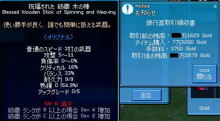 …え?レイブン靴? ハハハ…(ヾノ・∀・`)ムリムリ ということで、今回用意するのはコチラ。 接尾ESは紡織を選択。 紡織ランクが9になれば、最大ダメージ+2、最小ダメージ+1になります。 接頭ESはコレ。 ちょっと思うところがあって「犠牲の」ESは除外(・∀・) で、コレが下地になります。 「紡織」ESのランクは8なので、ランク7の「夜明けの」ESが丁度いい感じ。安いし。 ここからは一気にー!!(ノ゚Д゚)ノ 抽出! 貼り付け! もいっちょ貼り付…(;゚Д゚)!! 貼り付け!! 上手に出来ましたー!(´∀`) ちょっと耐久減っちゃったけど…(・ε・)キニシナイ!! 2009.02.21 Sat 00:02:36 ギルド de ペッカ下級!ペッカ…というと、誰もが恐れを抱く上級ダンジョンとして有名です。
