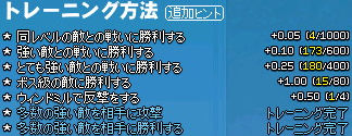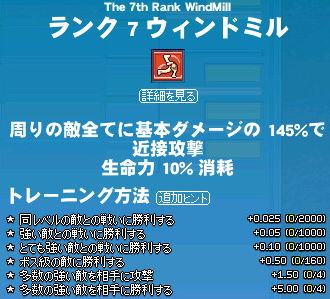 で、ちょっと欲しいものがあったので火山トカゲさんのお世話になりにきたのですが… やっぱり「とても強い敵」止まり。 で、DEX低下装備を貸してくれたギルドメンバーが弱体化装備を持ってるというので。 借りちゃった…(;´∀`) 結構すぐ諦めちゃうんだね、仕方ないね。 コチラがお借りした装備。 その方もエルフなのでエルフ限定装備です…(´人`)アリガタシ 弱体化装備をつけると火山トカゲも「ボス級」となり… ボス級も簡単に上がっていきます! そんでもってぇー、 ランク6に!(ノ゚∀゚)ノ PR 2009.02.23 Mon 17:26:58 ウィンドミルランク8→7 俺より強いヤツに会いに行くウィンドミルランク8からトレーニング内容に「ボス級の敵に勝利する」の項目が出たので、ボス級を探して…