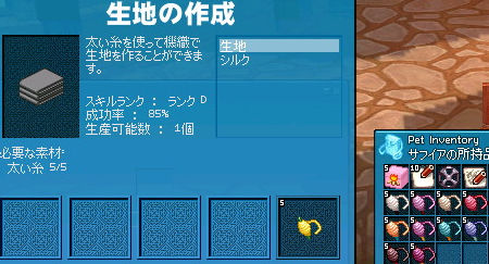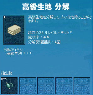太い糸、細い糸、安い革紐を埋めてもトレーニングが終わらないんですよね…(´・ω・`) このランクで初めてシルクやら、生地やら作ることになります。 トレ内容見れば分かりますが、なんとなく生地トレのほうがウェイトが高い感じ。 てことで、ここは生地を埋めて突破を狙います!(ノシ゚Д゚)ノシ 最高級生地を狙って、いざ生地作り開始! +0.3 +0.1 +0.1 …進んだ実感が薄すぎる…(;´Д`) あと、 紡織手袋がたっかい上に、速攻で壊れます。 しかも最高級生地ばっかり出来るのかと思いきや、実はそんなことはないという。 紡織の大変さは 8>A>9>D>6>B>C>7>E>F らしいのですが… こ、コレで4番目なの?(;´Д`) まぁ、それは過去のこと… 今は分解という錬金術があるのですよ(*゚Д゚)チョイサー! コレで使わない生地もあっという間に素材に元通りです。 HAHAHA!!この調子で生地全部分解しちゃってくださいよぉー!! と思いきや、 安い生地と普通の生地は分解不可なんですよねー。 世の中そんなに甘くないですよねー。ですよねー。 ヽ(`Д´)ノウワァァァン!! そんなこんなで、分解のほうはシコシコとトレーニングして… ランクDに!(ノ゚∀゚)ノ ちなみにシルクなら安かろうが高かろうが分解可能なので、紡織はシルクで進めることにします。 またクモを追いかける日々が始まるお… 2009.02.08 Sun 15:20:25 サブジャイアントの分解F→E今後の生産スキル上げ補助のために、サブジャイアントで分解を会得しました。