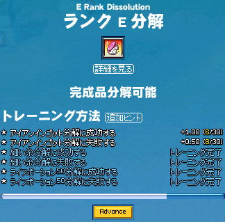っていってもFじゃどーしようもないので、ちまちま上げていくことに(ノ´Д`)ノ メインの紡織で作った細い糸で成功/失敗トレを埋め! …また失敗トレがあるのか… と絶望しそうになりますが、分解の成功率がかなり低いのでソレほど苦にせず進みます。 (アルケミマスタリを上げたり、錬金日(土曜日)に分解すれば成功率は上がります) ポーション調合はまだ手を出す段階にも至ってないので、ギルドメンバーから作ってもらいました(・ω・) まぁただではなく、「シルク分解できるようになったら殺ってね☆」という交換条件ありきですけど。 ちなみに抽出物は、右?に行くほど抽出率が悪いような感じがします。 ベースハーブはポコポコ取れるけど、レッドハーブは殆ど取れません。 たまにこんなんがあったり、なかったり(゚∀゚) そんなこんなでー! ランクEに!!(ノシ゚∀゚)ノシ 2009.02.07 Sat 01:11:33 コレンの要請G9の記事が続きます。