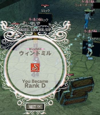ギルドでダンジョン中にミルトレしてランクD! ウィンドミルは周りの敵を巻き込むので、正直言ってPTプレイでは迷惑をかけたりかけなかったりします。 状況を見極めて使うことが大切なんですよね(`・ω・´) さてさて、ミルトレと言えば「多数の強い敵を相手に攻撃&勝利する」が大きいウェイトを占めます。 なので、 ロンガ遺跡ダンジョンへ(ノシ゚∀゚)ノシ 自分ひとりでPTを組んで、フィニッシュルールを全員に変更、弓でサクサク倒してからミルのトレーニング! こんなんでー! こうー!!ヽ(゚∀゚)ノ ウィンドミルトレーニングは自分の強さが影響するので、ここがオススメ!!ってのはないんですよね。 ミミックが「強い」ランクだと通常ダンジョン回ってれば簡単に埋まりますケド…メンドクサイ('A`) そんなこんなで。 ランク9に(ノ゚∀゚)ノ このランクから準備時間が短縮されて使い勝手が格段によくなります。 どの型でもこのランクになれば色々と使い道が出てくるはず…はず。 還元クエストでAP+3! ちなみにエルフの弓師がウィンドミルを上げる理由は、 1. 弓を外したときの対応 (死亡率の軽減) 2. will値上昇によるクリティカル値の上昇 近接でのダメージUPだとか、STRの上昇値なんておまけみたいなものなんですよ!(゚Д゚ ) 2009.02.02 Mon 01:17:37 ノイタールアラトG9 ノイタールアラトより影ミッション「魔族の秘密実験調査 - クラウソラス」でっす(゚Д゚)カッ