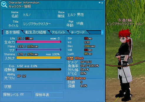 なんか10歳児は頭と体のバランスがおかしい気がします… まずは探索レベル上げ(ノシ゚∀゚)ノシ リッチスケッチクエストの持越しを完了して、 探索LV5に。(素のレベルも5に) そのあとはキャップを外しつつ、 溜め込んだ遺物を吐き出して探索LVを一気に15に! さてはて。 前回は精錬を上げきるという目標を立てて、ソレを達成したわけですが。 今回は「ウィンドミルをランク5」にします。 まずはFで止めていたのをEに。 よく熟練者は初心者に対して「ウィンドミルは先にあげたほうがいいよ」といいます。 マビノギのシステムをあんまり理解していない初心者は( ゚Д゚)ハァ?と感じます(オレ含む) そこら辺の理由も含めて、ウィンドミルについて追々書いていこうかと思います。 ウィンドミルは先にあげたほうがいいよ!! 2009.01.27 Tue 01:29:43 メインとサブの6週無料転生12月の大型アップデートから「6週での無料転生」が実装されたので6週で転生します!(ノ゚∀゚)ノ