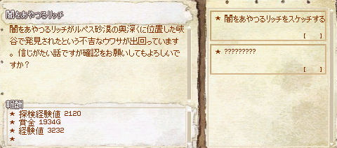 コール村の探索レベル上げで探索レベルが20になったらコレ!(ほぼエルフ限定ですが) ちなみに場所はここ。 近くにムーンゲートがあるので、エリン時間で6時ごろ移動(ノ゚Д゚)ノ ハイド→スケッチ→ハイドで楽々クリア(・ω・)y─┛~~ 周りには強力なモンスターがうようよしてるので、エルフ以外は厳しいかもです。 ちなみにアークリッチが沸くのは、 平日(月・水・金) : ET24:00 ~ 6:00 休日(日) : ET20:00 ~ 6:00 他の曜日も雑魚片付ければ沸くっちゃ沸きますが…メンドイので(´∀`) 帰り道にルペス砂漠で道に迷ったエルフを掘り出してー! これで探索経験値は 200(リッチスケッチ)+40(夜間スケッチボーナス)+2120(リッチクエスト)+1000(道迷エルフ) = 3,360! 1日×8チャンネルで合計26,880稼げます(*´∀`)ウマーイ (・~・) 2009.01.23 Fri 01:06:48 コール村周辺で探索レベル上げもうすぐ転生できるようになりそうだったので、遺物を集めて探索レベル上げ(ノシ゚∀゚)ノシ