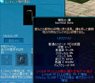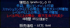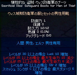 Willの値が高いと、死んだときにデッドリー状態になることがありますが、 ライフが半分以上ある状態で、それ以上のダメージを受けると必ずデッドリー状態になる。 というマビノギのシステムを利用した型です。 例 (最大LP(ライフポイント)が10の場合) 1.10以上のダメージを喰らうと必ずデッドリーに 2.ライフが5残っている状態で5のダメージを喰らっても必ずデッドリーに 利 点 ・一度喰らっても生き残る可能性が高くなる マイナス点 ・囲まれると即死亡 ・アイスボルトなどの連射魔法でも即死亡 ・攻撃力が極端に低い敵に出会うと即死亡 ※※※ ここまでを前提に、最近の影ミッションの敵が攻撃力が低すぎて非常に辛い!! (LPが20そこらでも、与えてくるダメージが5~10とかなのでデッドリーになりづらい) こうした場合どうするか? 低ライフ型なんだからLPを下げるしかない!!(という短絡的な考え方) 現状はというと、接尾エンチャント全てに「盗賊」を張ることによってLP‐75(アクセサリ除く) さらに下げるには?と検討した結果。 接頭にLPマイナスエンチャントを張る! スマッシュがC以上になると最大ダメージ6上昇の恩恵が得られなくなりますが、 まぁ今後あげることはないでしょう…多分。 手袋、靴用に2つESを用意したかったのですが、あいにくあまり出回るものでもないらしく。 しょうがないので、 燃やすものを購入、7万G。 もちろん燃やすのはギルドメンバーのエンチャンター。成功率は47%(だったかな) さて… ここからスーパーがっくりタイム!! _| ̄|○ il||li _| ̄|○ il||li _| ̄|○ il||li …まぁ4回目でようやく抽出できたんですけどね。 出来たんですけど。 ES貼り付け成功率90%も失敗…(´Д⊂ モウダメポ そのあと無事貼り付けは成功し、完成した装備がコチラ。 ついでにブーツのほうはこのあとシモンの98%修理も失敗して最大耐久度‐3に/(^o^)\ 2009.01.09 Fri 01:40:43 誘われて メインクエ2009.01.08 Thu 02:09:23 ギルド de 影ミッション!精錬が終わったので、もう色々しちゃうぜ!