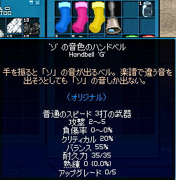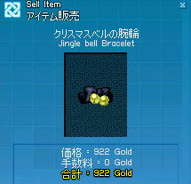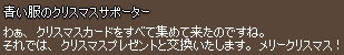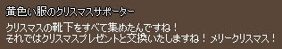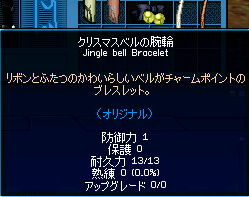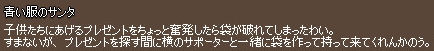 まずは手紙から。 (n‘∀‘)η<メリークリスマス♪(っていうかコレカードだったのね) もらえたのがコチラ。 楽器、しかも1音です。 楽譜持ってないので鳴らせませんでしたが、他人のを聞いた印象は単体では騒音でしかない。 全部の音をそろえて合奏したら面白いんでしょうね(´∀`) お次は靴下! ('A`)<メリークルシミマス… もらえたのがコチラ。 ケーキ帽子、三角帽子、クリスマスベルの腕輪の3種類からランダムで。 一応「クリスマスベルの腕輪」がレア品なのでは?とのこと。 うーん、でも…微妙… 他の人にあげられない仕様らしいので、売っぱらうことに。 (イベントリ圧迫されるんで) まぁ…イベント品なんてこんなもんですかね。 「手放せないアイテムです。」 Σ(||゚Д゚)ヒィィィィー!! 2008.12.29 Mon 01:39:57 サンタ…ブルー…やっとラストだよ!最後は青いよ!