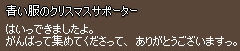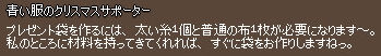 またミニスカビッチか。 はいはい今度は何をすればいいんですか。 もうあんたらサンタやめちゃえよ…ってまたミニスカと共同作業なの!? そんなこと言ってまた作らせるつもりなんでしょ! もう知らない! とはいえ、やらないとクエストが終わらないので… あ、あんたのために用意するんじゃないんだからね!クエストのためなんだから! ヽ(`Д´)ノウワァァァン!! まぁ何とか「太い糸×1」「普通の生地×1」を用意して、ミニスカの元へ。 (それにしても「普通の生地」を「普通の布」と書いてあって何を用意すればいいかわからんかった…) 何このいい子。 で、コレにて全てのサンタを助けたわけですが。 サンタ一人一人が手紙と靴下をよこすおかげで、無課金のイベントリはかなり悲惨なことに(´Д`;) |