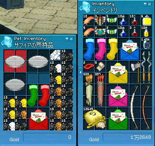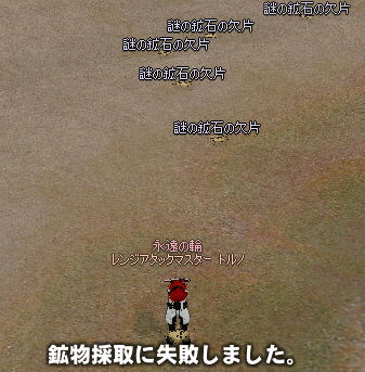 しばらく実家に帰郷してまして、4日間空いてしまいました… もうお餅はいらないよ(;´3`)ウップ 今年も「間延び。」はマイペースに更新していこうと思いますので、よろしくお願いします。 ※※※ さてさてマビノギの方ですが。 精錬のランクを2から1にするために寝ても覚めても鉱物採取。 (っていうかホントに夢に出ました。) そんな中ギルドメンバーが「収集速度増加ポーション」を大漁に!(゚∀゚) かなり無茶な速度でふるいを振るいます! 体感で1/3くらい早くなる感じですかね。 っていってもまぁいつも通りなんですけどね。 必要鉱石の目標はランク2→1に必要なミスリル600個(ミスリル成功40×5、失敗80×5) 失敗トレーニングを全部埋めるつもりなら、+αは必要ですけどね(´∀`) その目標値に達するにはどれだけの時間がかかるのかちょっと計算。 ■ふるいを3つもって壊れるまで収集を行う場合。 スキル : 鉱物採取ランク9、メイキングマスタリランクE 収集時間 : 約1時間30分 収集鉱石 : 謎の約150個、鉄約80個、銅約70個、銀約10個、金約15個、ミスリル約15個 (もちろんばらつきはあります) 1日3時間鉱物採取をすると仮定した場合、ミスリル600個を集めるには約20日かかります。 うん…どおってことないない('A`) さぁて。 Are you ready? 2008.12.30 Tue 01:57:38 サンタクエ 報酬各サンタから貰った靴下と手紙ですが、コレと引き換えにミニスカから報酬を貰うことが出来ます!