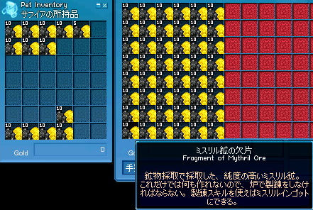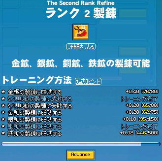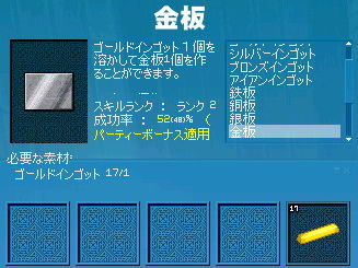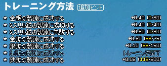 ちなみに現時点のトレーニング状況。 ミスリル600個集めるまでに大体こんな感じで埋まってます。 だから金、銀を残しておくと多少楽になりますよ…とほほ(ノД`) ここからミスリル成功、失敗と金板のトレーニングを埋めていきます! (ちなみに用意したのはミスリル鉱石600個、金インゴット160個) …まぁミスリル鉱石トレはカット。成功40、失敗65でした。 フィリアでミスリルトレ終わったらバンホールへ直行!金板トレへ。 いつもDEX装備を貸してくれた人とPT組んで52%。 金インゴは多めに用意しておかないと、 「金板が作れなくてランクアップできない…くやしい…でも感じちゃう!(ビクンビクン)」って事態に陥るので注意。 精錬ランク9→2の間は何かしら作るごとにスタミナを10消費するのが超イタイ。 そんな紳士淑女のあなたにコチラ、スタミナエリクサー! 5分間だけスタミナが減らないと言うステキな時間をお届け。 そんなわけで!! ねんがんの せいれんらんく1に なったぞ レア そう 関係ないね 2009.01.04 Sun 01:06:52 鉱物採取を考えるあけましておめでとうございます。