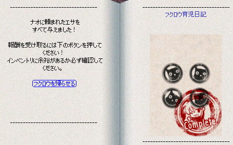 ↑厄介ごと。 1時間に1回エサをあげることができ、4回やるとアイテム引換券になります。 このアイテムがレアアイテムがふんだんに混じっていたために、イベント当時は全チャンネル満員とか… 別名「放置イベント」(;´Д`) そんな私もリッパに放置してました。 さて結果はー!? まぁ、こんなもんですよね… クソァ!! 唯一でたレアは、 氷の魔女ドロップの「氷の薔薇」。 2×2だとは思わなかった…ちょおでかい! 紳士的に相方へ贈呈。 決してイベントによって値段が下がってるから売らなくていいや、と思ったわけではないですよ。マジで! 2009.12.15 Tue 23:58:51 初王城影クエ パルホロンの幽霊2009.12.14 Mon 23:58:16 くるくるくるりんここらが10月~11月のキングクリムゾンが発生した時期です。
